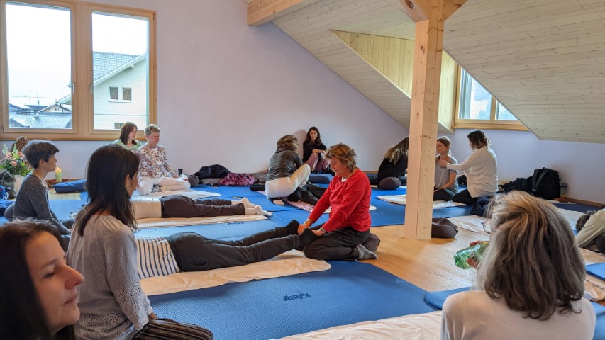Another amazing workshop in Kientalerhof! There is definitely something about this place, as the experience goes so deep and rich here. A real transformational space. This year we were 14 people in the room including myself, a translator and assistant. The group was mixed with people mostly having a shiatsu background, but there was also a doctor and a vet and some people with trauma backgrounds. The beginning was a bit hard work as most students had snow travel difficulties but the group settled down and by the end of the workshop it felt very rich and full. As planned I made a first step towards creating a course for working with anxiety, emotional pain and trauma and will continue to evolve this course next year! This year I was able to offer treatments around the edges of the course and I felt this really contributed to the depth of the work as a transformational experience.